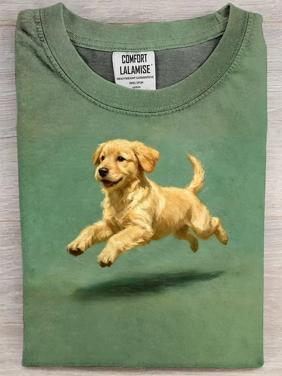 Retro Cute Run Golden Retriever Art Print Casual Pure Cotton Short Sleeved T-shirt