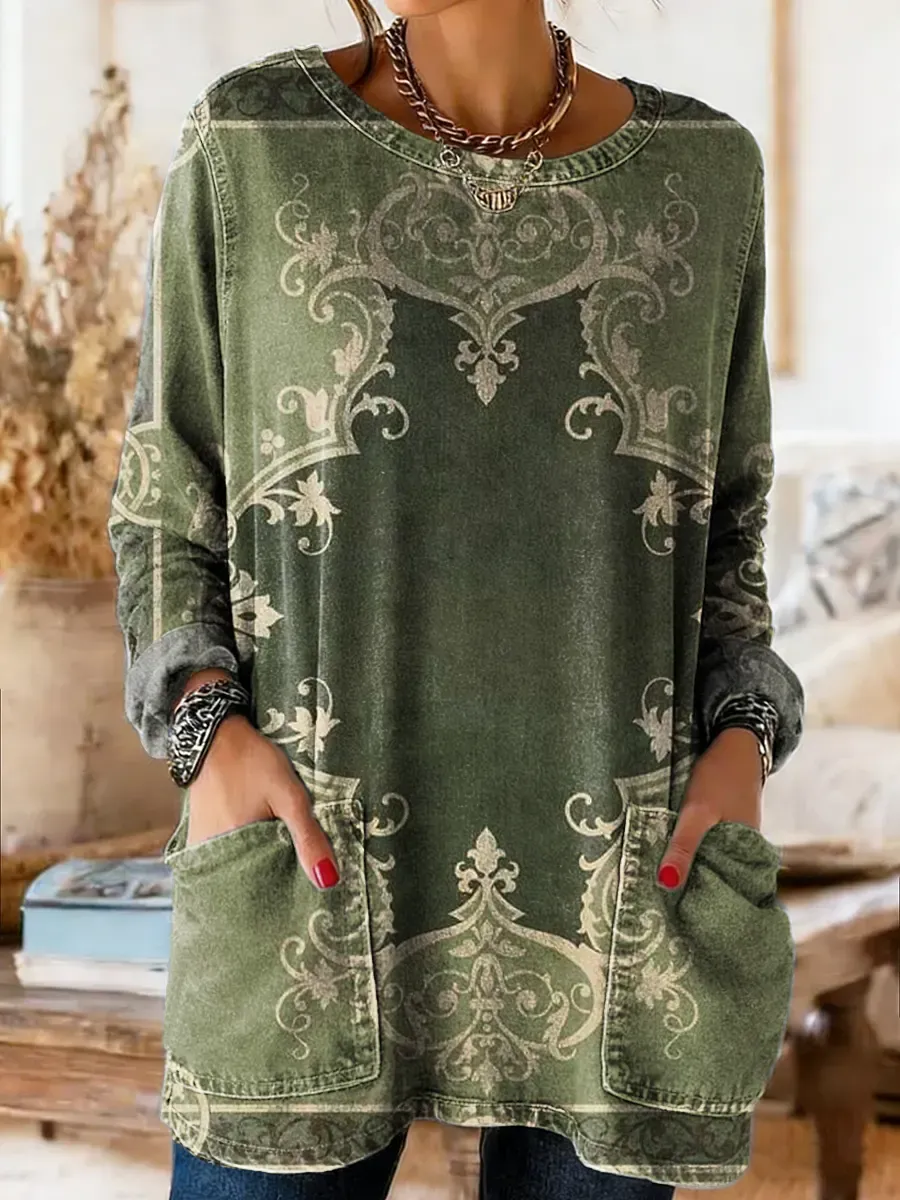Retro Green Floral Art Print Casual Washed Denim Cotton Top