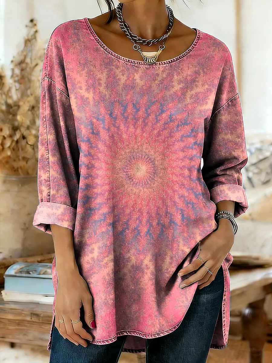 Vintage National Kaleidoscope Women's Art Print Casual Round Neck Washed Denim Cotton Top