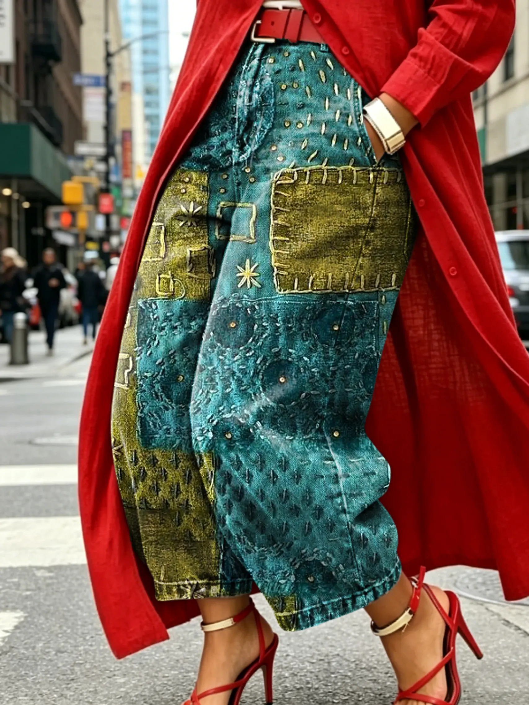 Women's Artistic-Print Jeans with Pockets and Contrast-Stripe Design