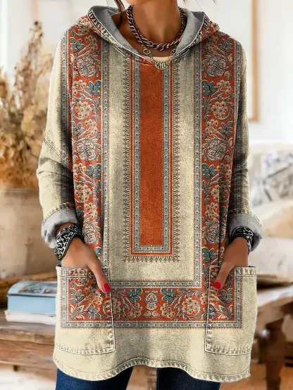 Women's Bohemian Ethnic Floral Art Print Hooded Pocket Cotton Denim Top