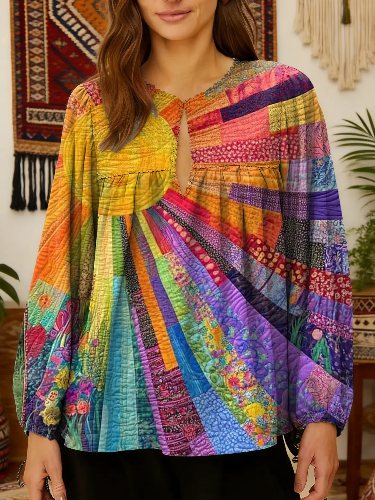 Women's Bohemian Multi-color Patchwork Sun Pattern Art Print Casual Long Sleeve