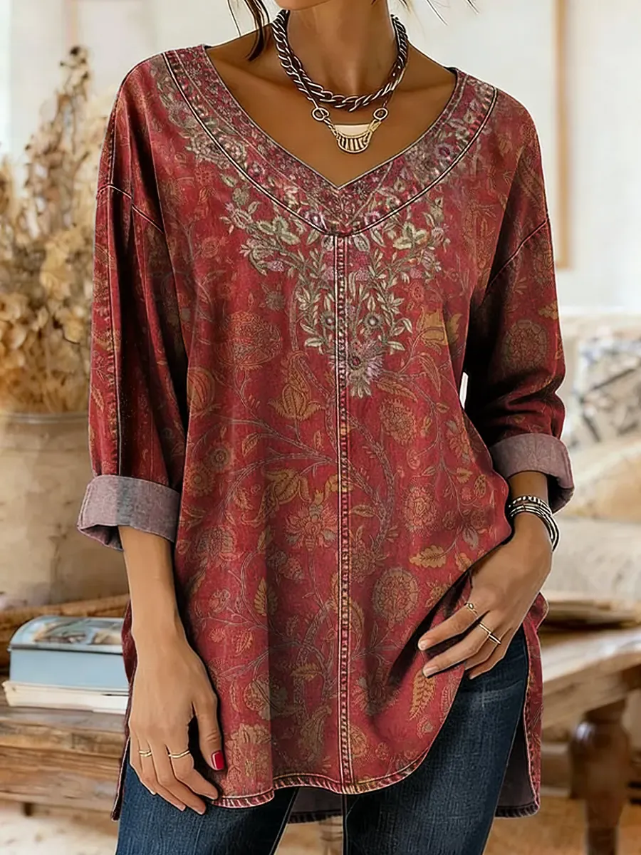 Women's Bohemian Retro Floral Art Print Casual V-neck Long-sleeve Washed Denim Shirt