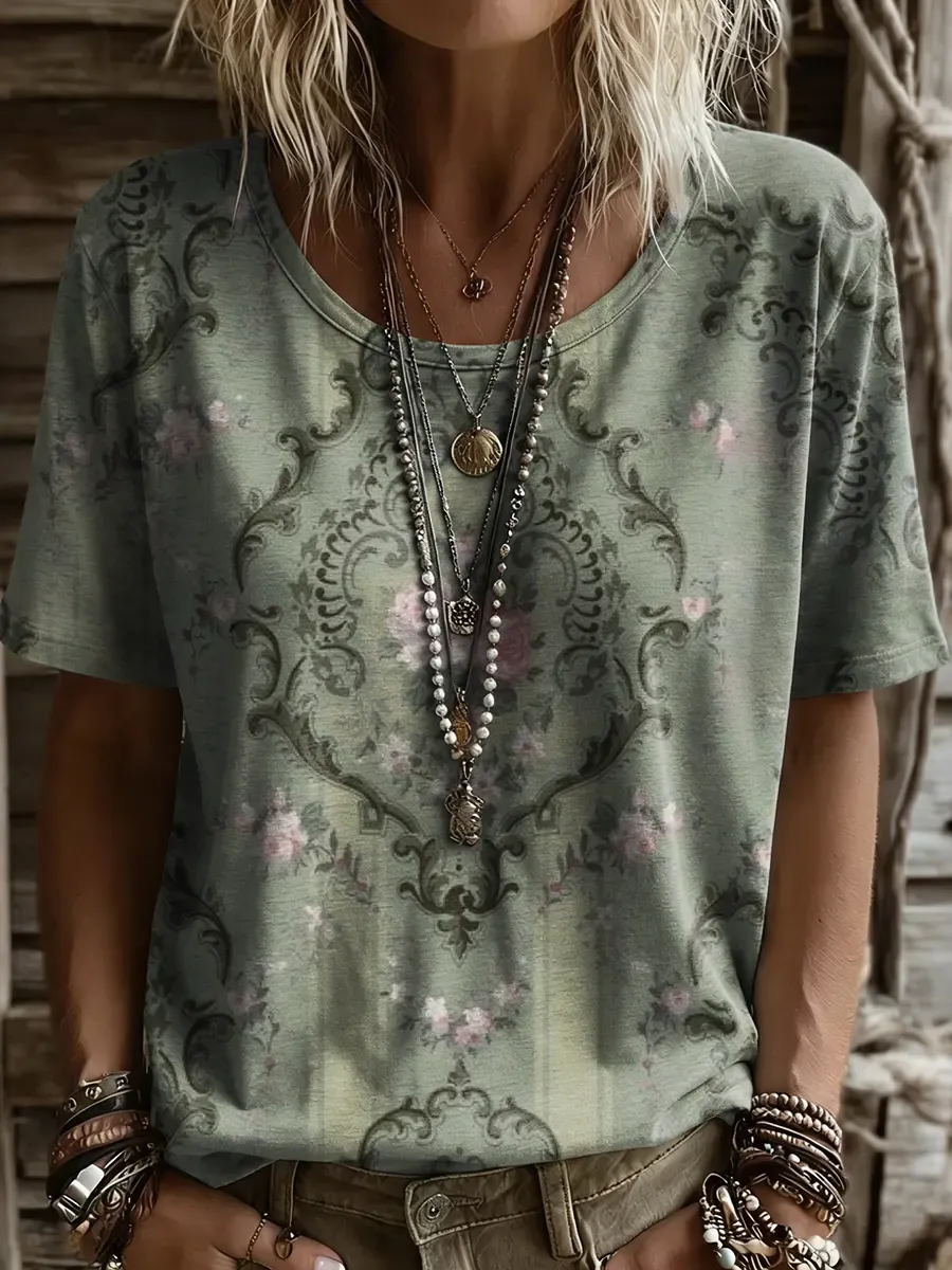 Women's Bohemian Retro Green Floral Art Print Casual Crew Neck T-Shirt