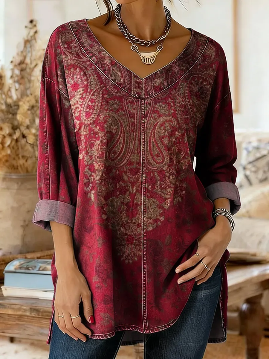 Women's Bohemian Totem Floral Art Print Casual V-neck Long-sleeved Washed Denim Shirt