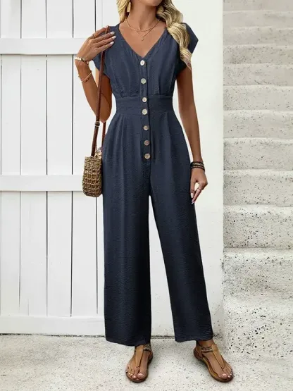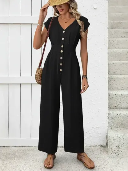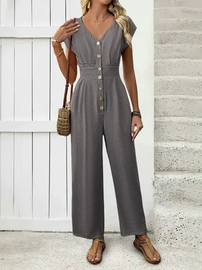 Women's Bohemian V-neck Short-sleeved Button Jumpsuit