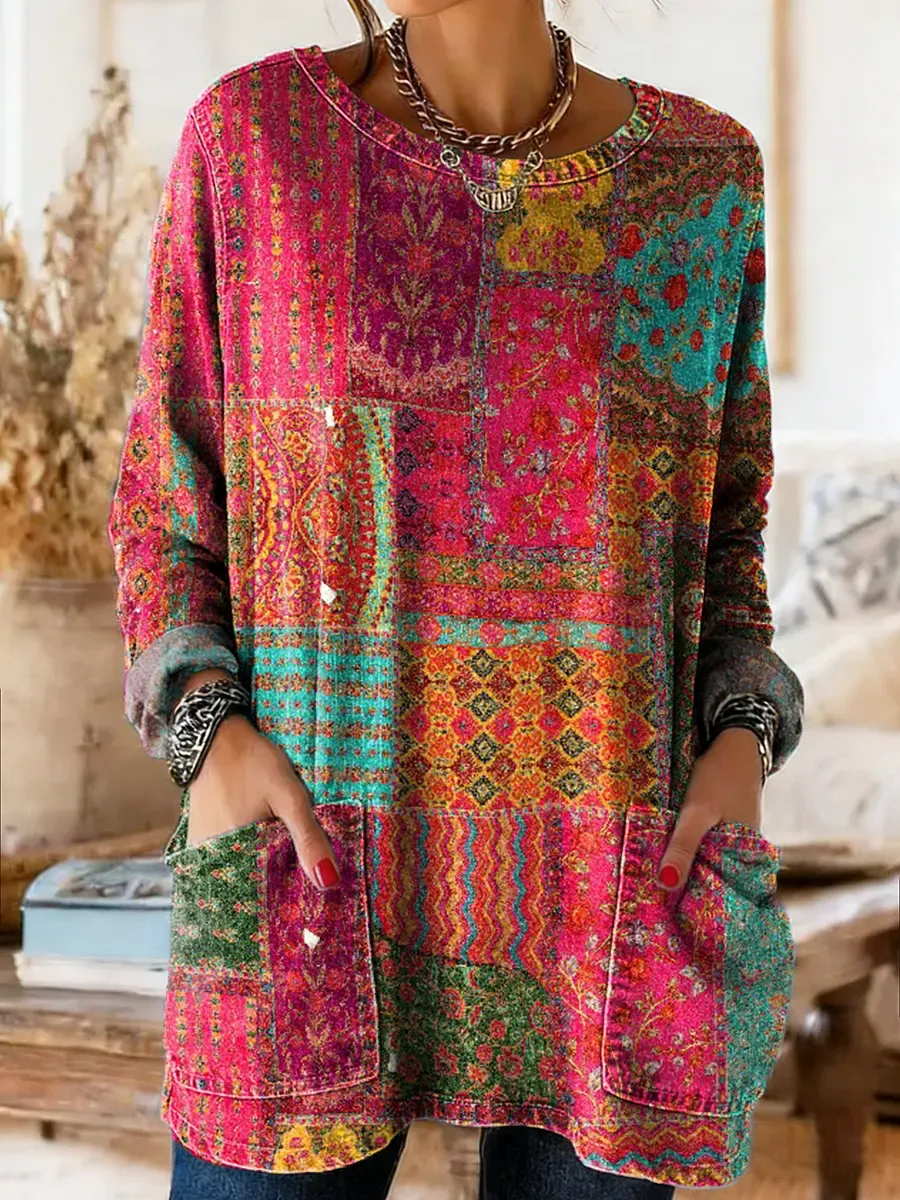 Women's Bohemian Vintage Patchwork Artistic Print Casual Washed Denim Cotton Top