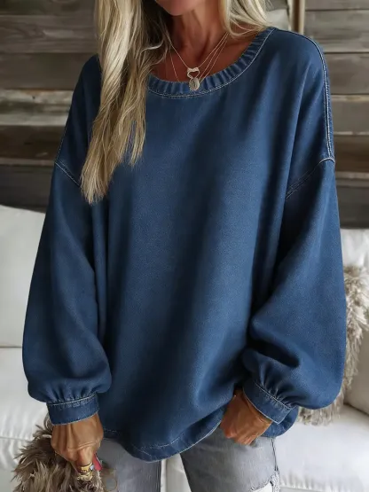 Women's Casual Crew Neck Long-sleeved Cotton Denim Top