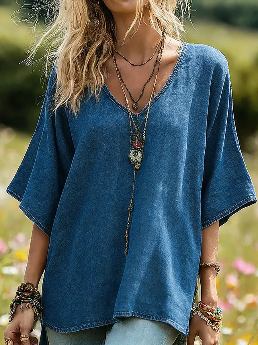 Women's Casual V-neck Half Sleeves Denim Top