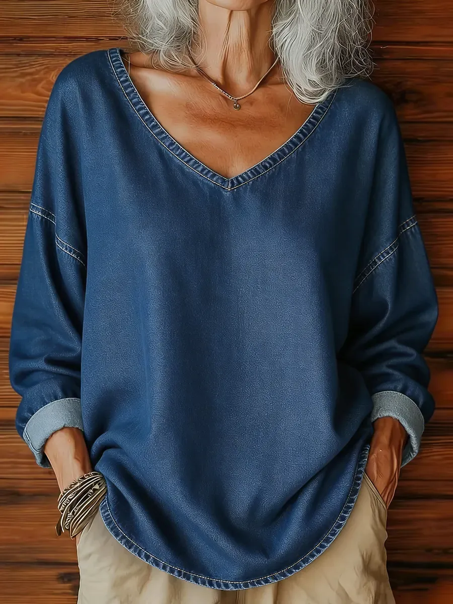 Women's Casual V-neck Long-sleeved Cotton Denim Top