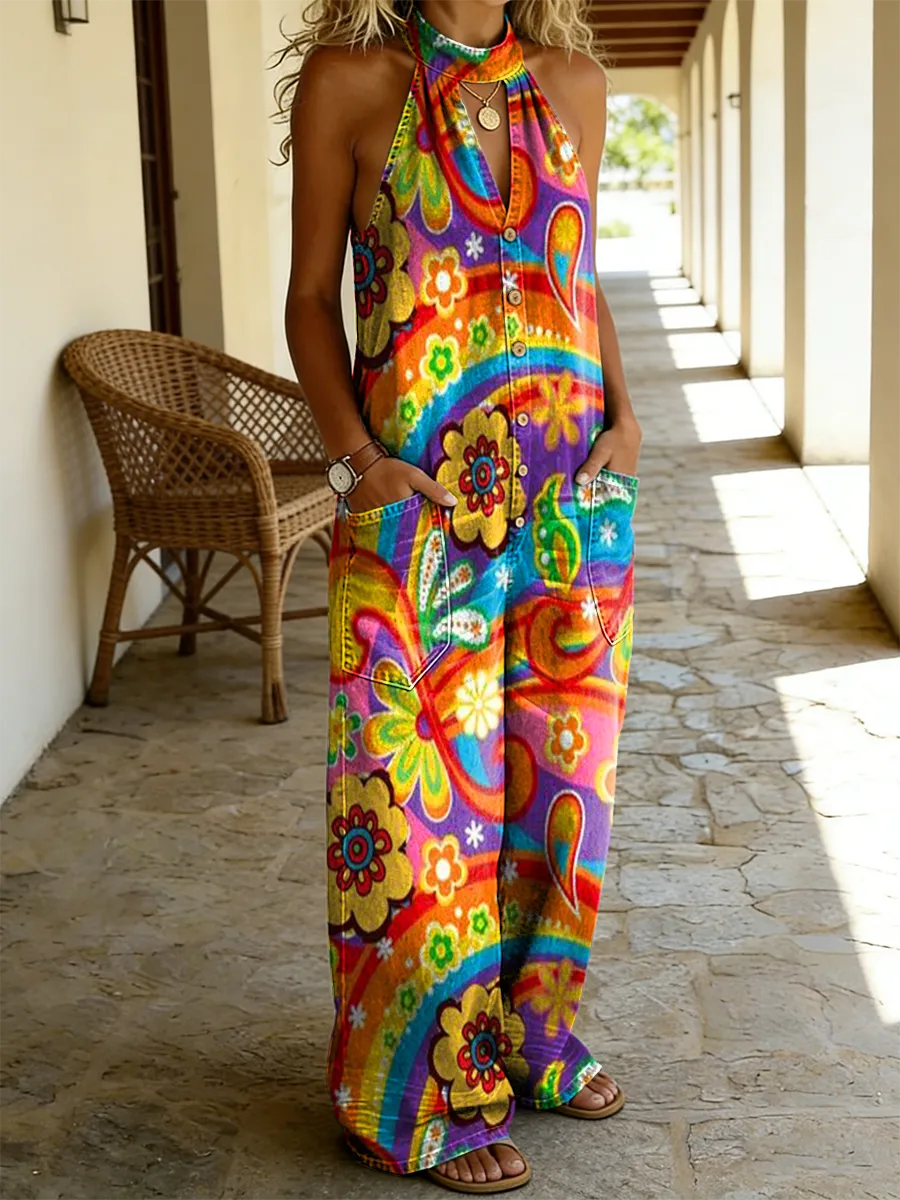 Women's Colorful Hippie Art Print Casual Sleeveless Pocket Jumpsuit