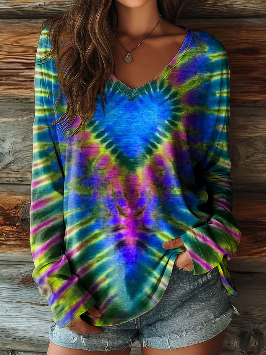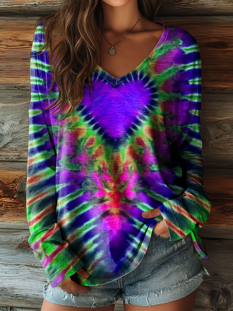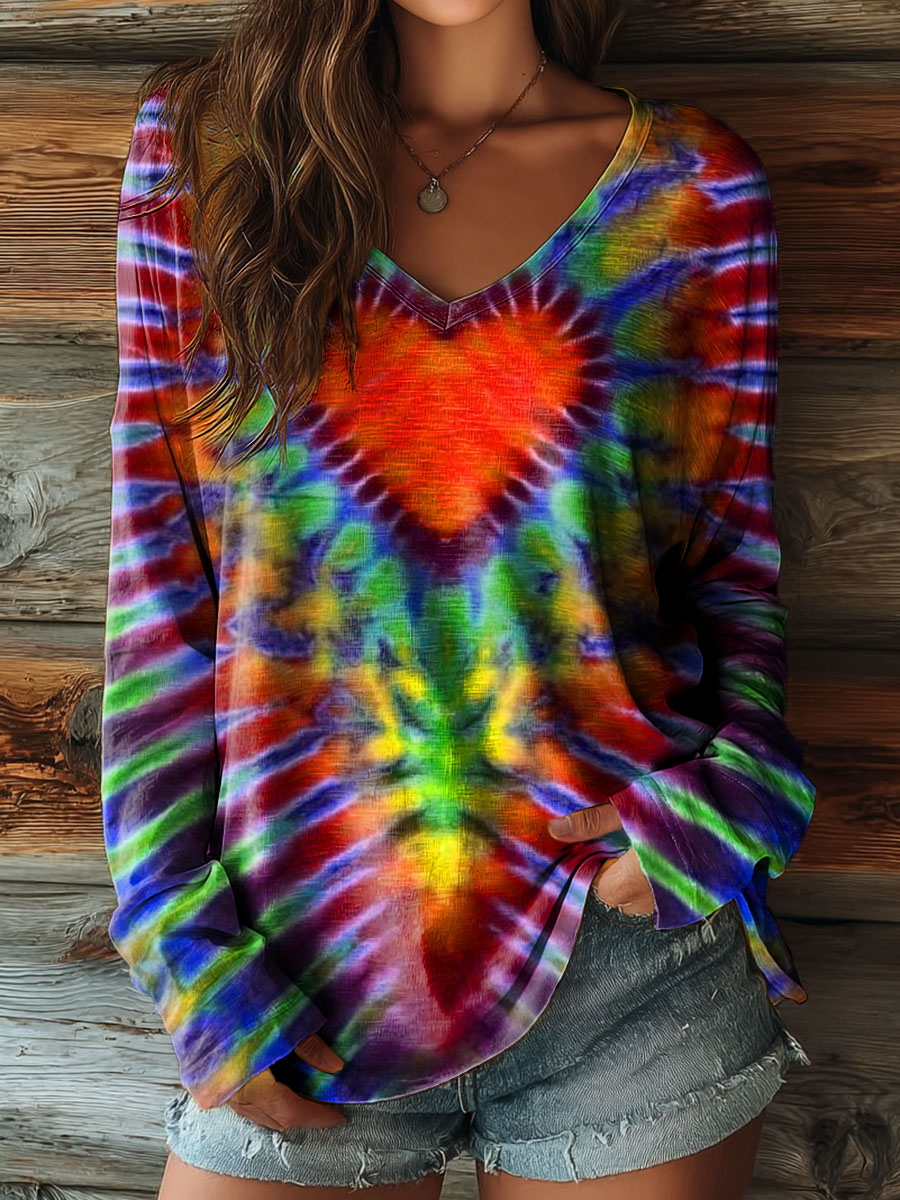Women's Colorful Love Heart Tie Dye Art Print Casual V-neck Long Sleeve T-shirt