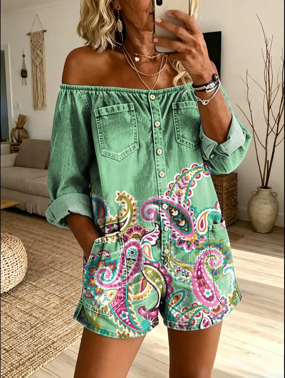 Women's Colorful Paisley Floral Art Print Casual Washed Cotton Denim Off-Shoulder Romper