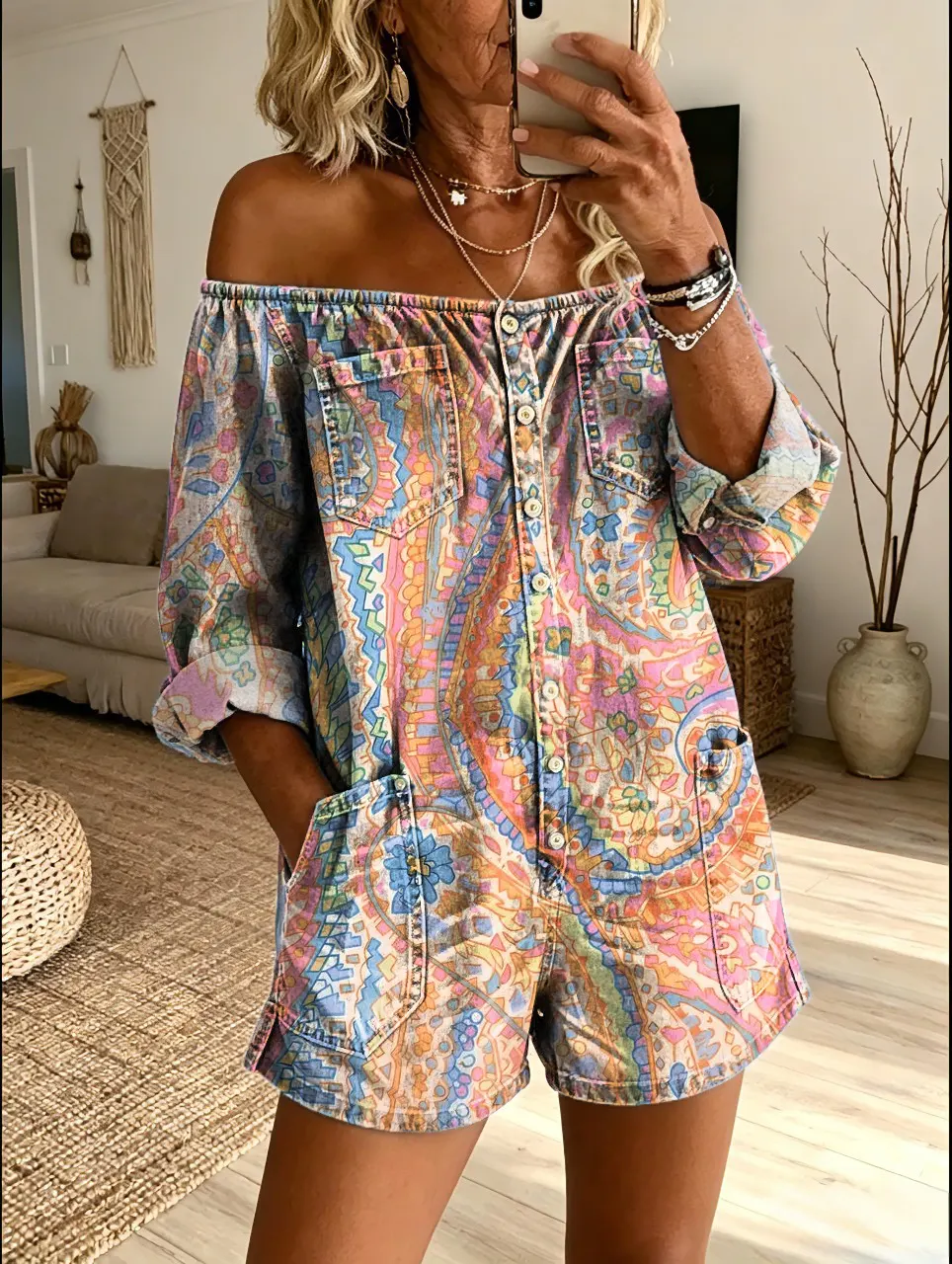 Women's Colorful Retro Paisley Floral Art Print Casual Washed Cotton Denim Off-Shoulder Romper