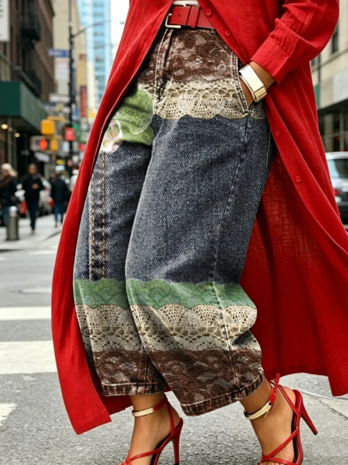 Women's Denim Jeans With Artistic Printed Stripes And Pockets