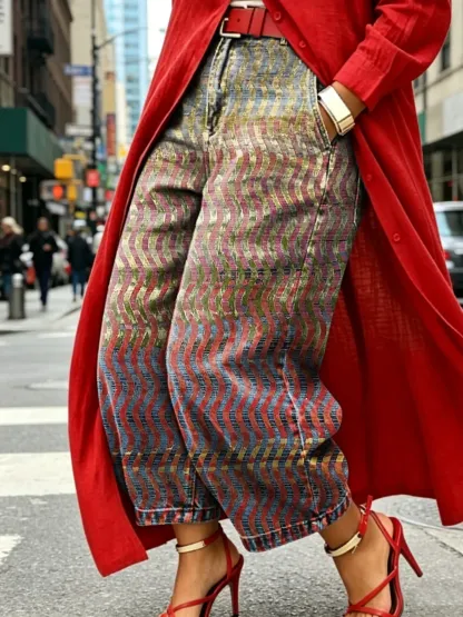 Women's Denim Jeans With Pockets And An Artistic Gradient Wavy Print
