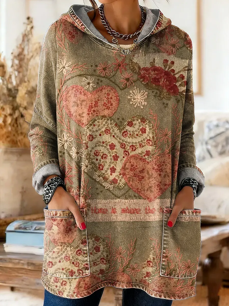 Women's Floral Heart Pattern Art Print Hooded Long-sleeve Top With Pockets