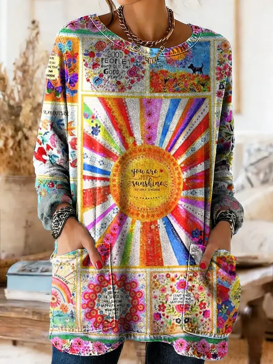 Women's Hippie Sun Art Print Casual Washed Denim Cotton Top