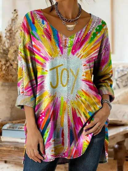 Women's Joy Art Print Casual V-neck Long-sleeve Washed Denim Shirt