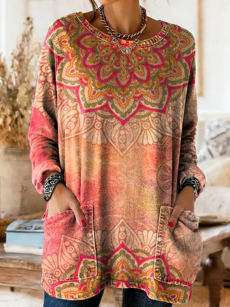 Women's Mandala Pattern Art Print Casual Long-sleeve Crew Neck Pocket Cotton Denim T-shirt