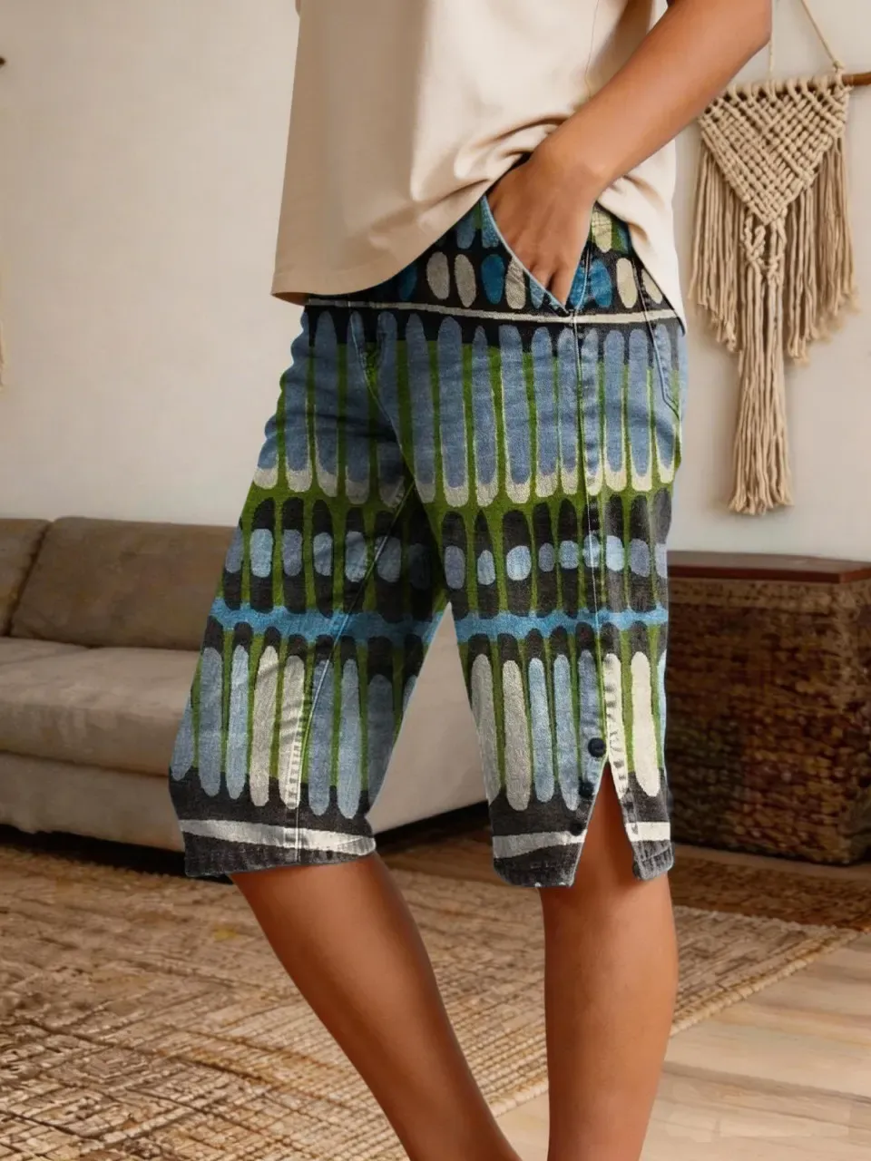 Women's Retro Abstract Geometric Art Print Casual Denim Shorts