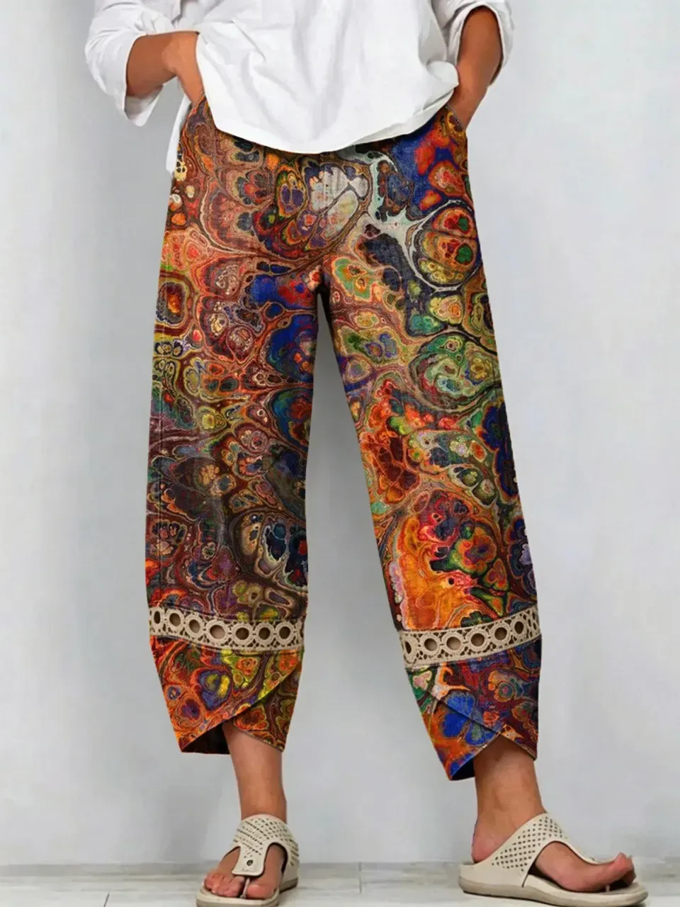Women's Retro Bohemian Art Print Casual Cutout Pants