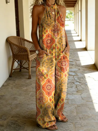 Women's Retro Bohemian Ethnic Art Print Casual Sleeveless Pocket Jumpsuit