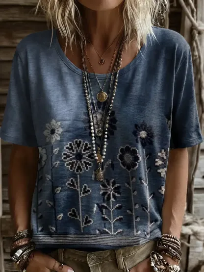 Women's Retro Bohemian Floral Art Print Casual Crew Neck T-Shirt
