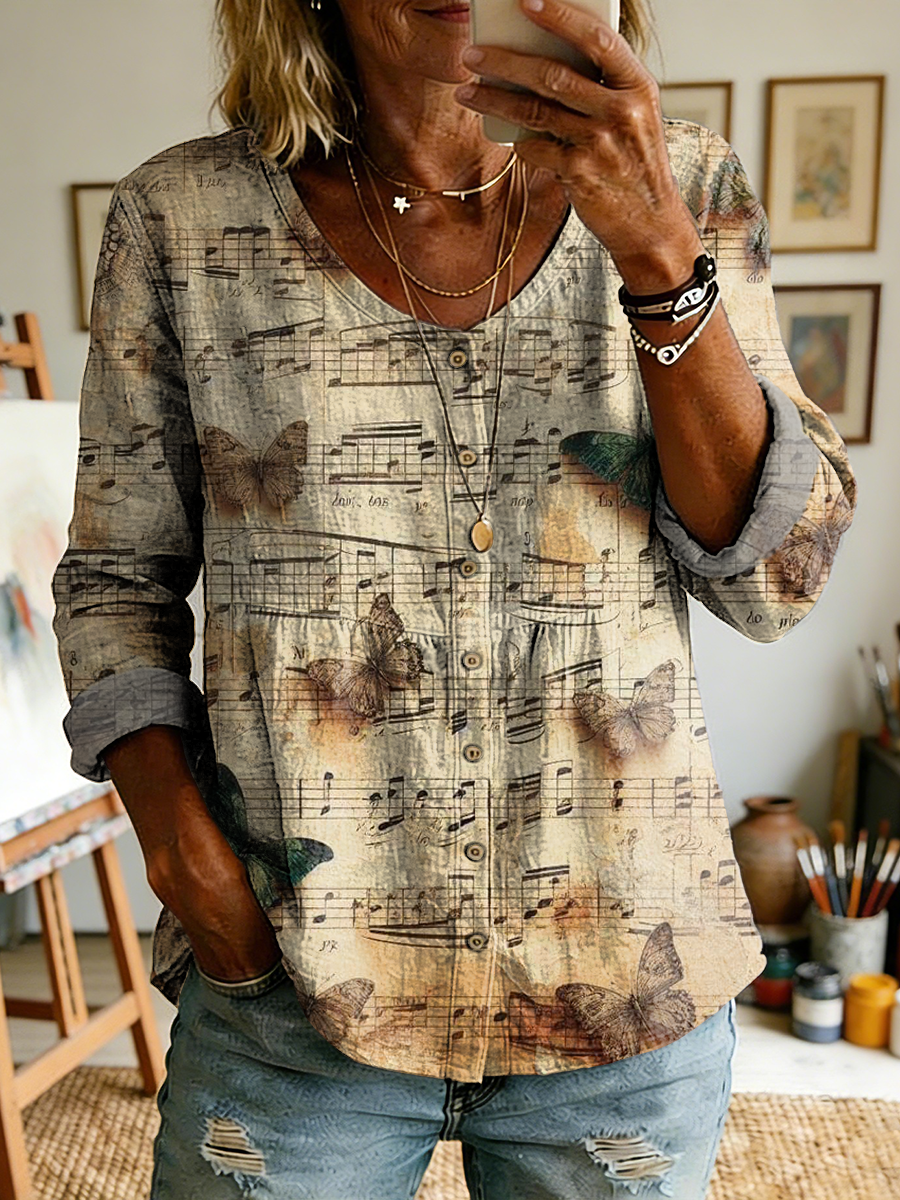 Women's Retro Butterfly And Sheet Music Art Print Casual Long-sleeved Cotton Linen Shirt