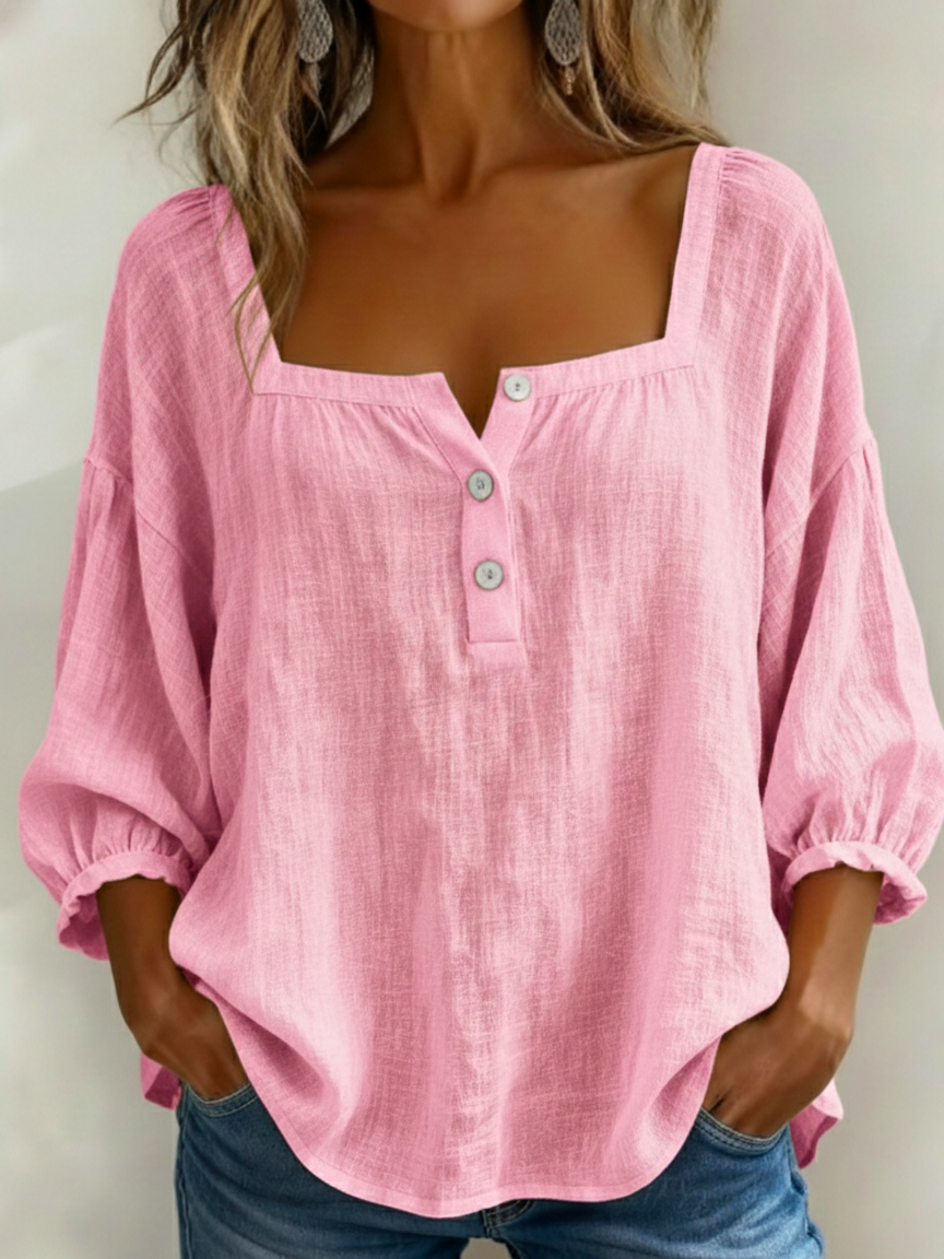 Women's Retro Casual Early Spring Square Collar Button Bubble Sleeve Cotton Shirt
