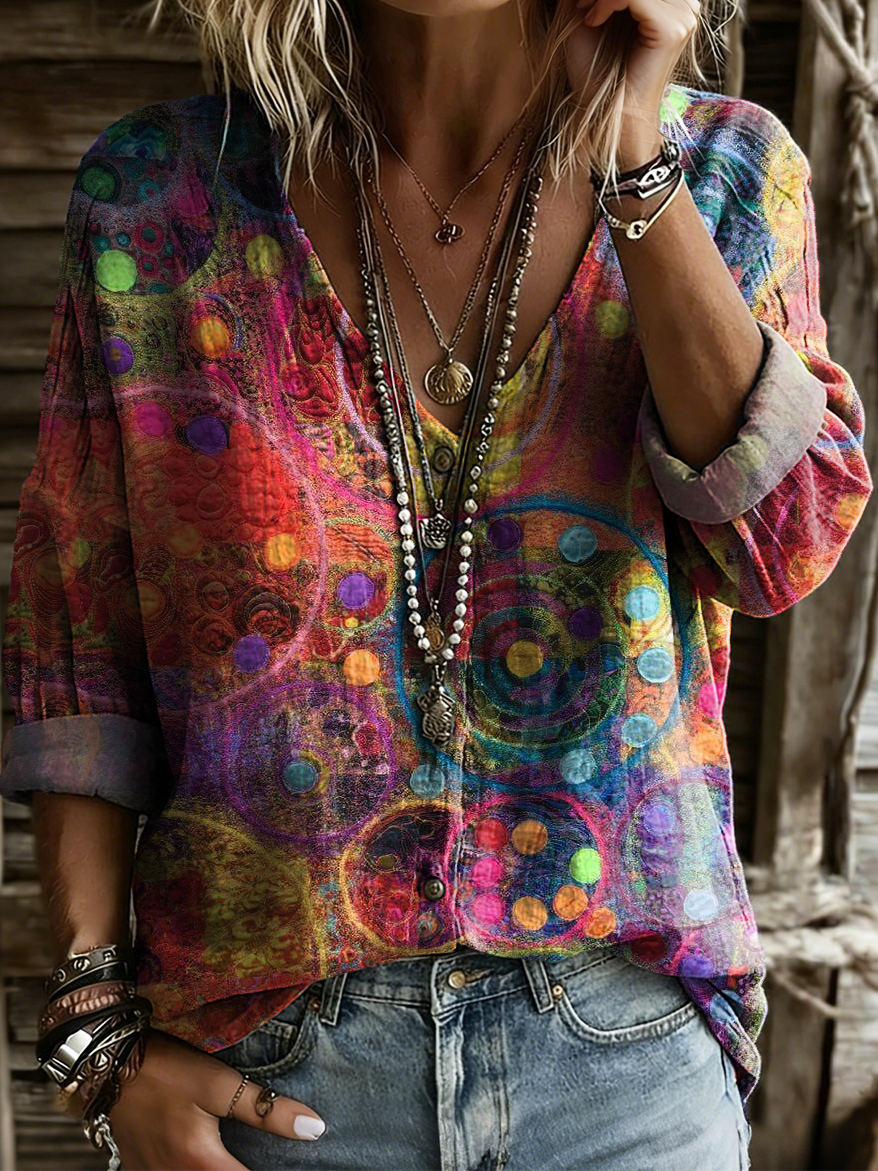 Women's Retro Colorful Art Print Casual Long-sleeve V-neck Shirt
