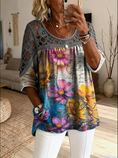 Women's Retro Colorful Floral Art Print Casual Three-quarters Sleeve Round Neck Hollow-out Top