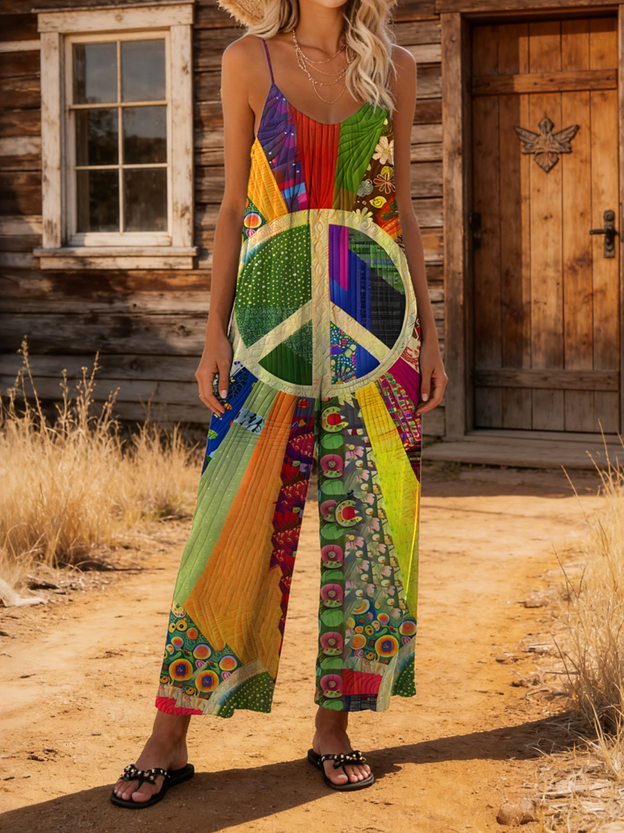 Women's Retro Colorful Peace Art Print Casual Spaghetti Strap Jumpsuit