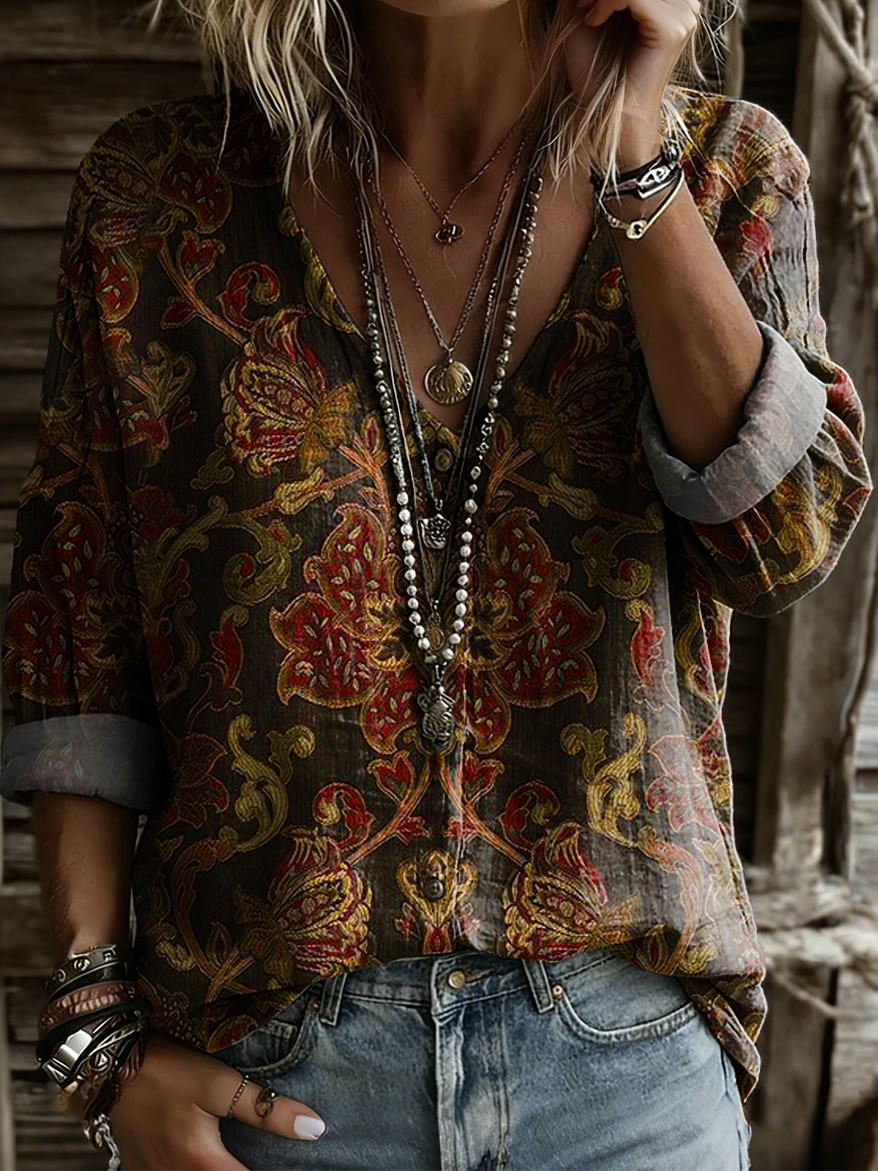 Women's Retro Ethnic Floral Art Print Casual Long-sleeve V-neck Shirt