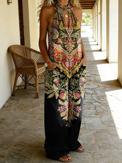 Women's Retro Ethnic Floral Art Print Casual Sleeveless Pocket Jumpsuit