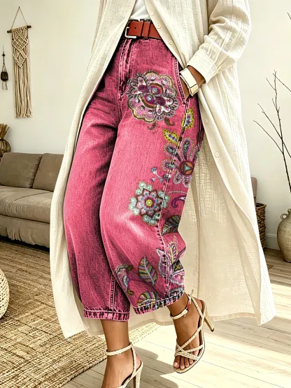 Women's Retro Ethnic Floral Art Print Casual Washed Cotton Jeans