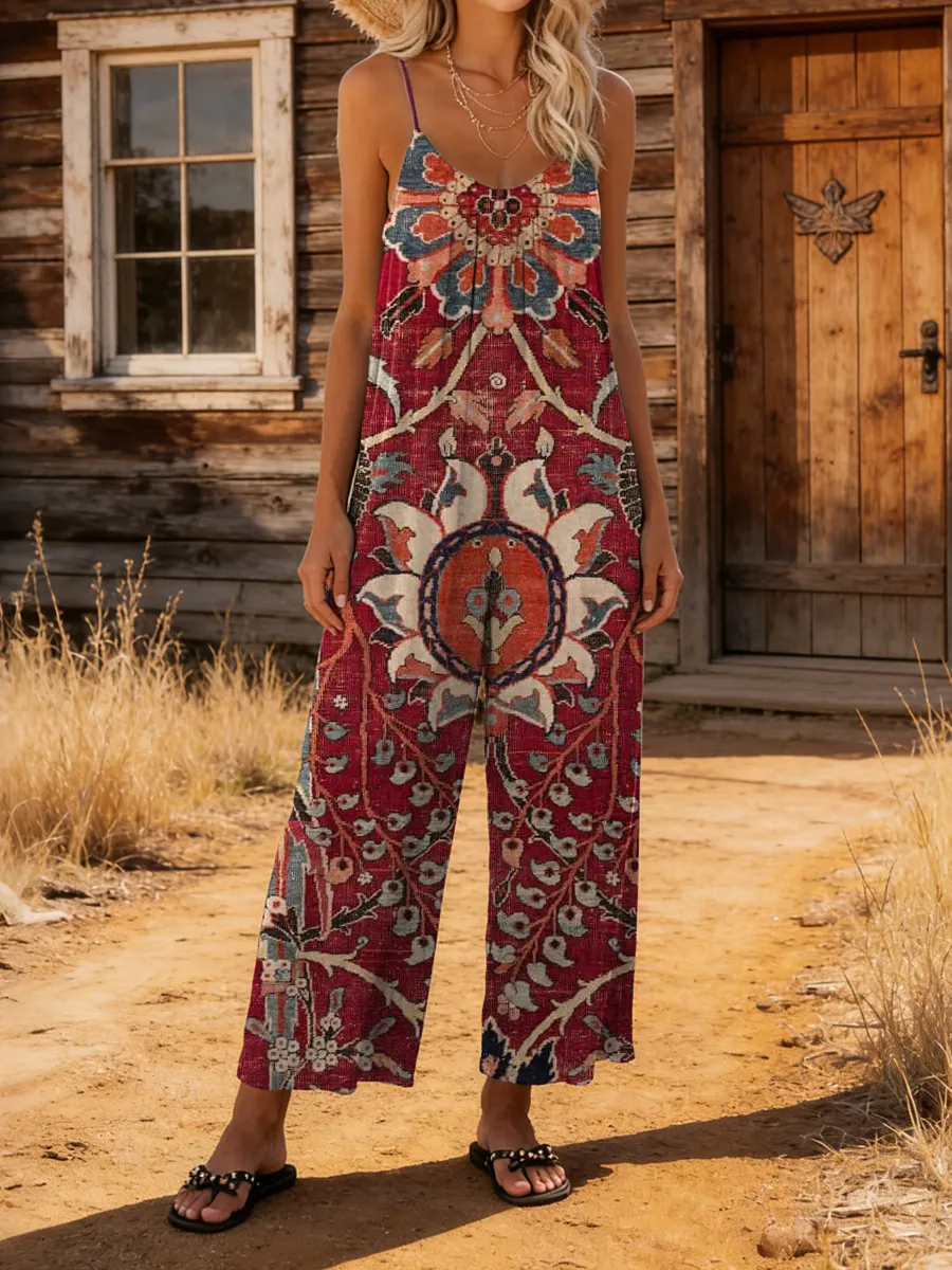 Women's Retro Ethnic Floral Plaid Art Print Casual Spaghetti Strap Jumpsuit