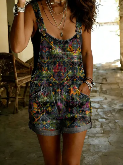 Women's Retro Ethnic Totem Art Print Casual Sleeveless Jumpsuit Shorts