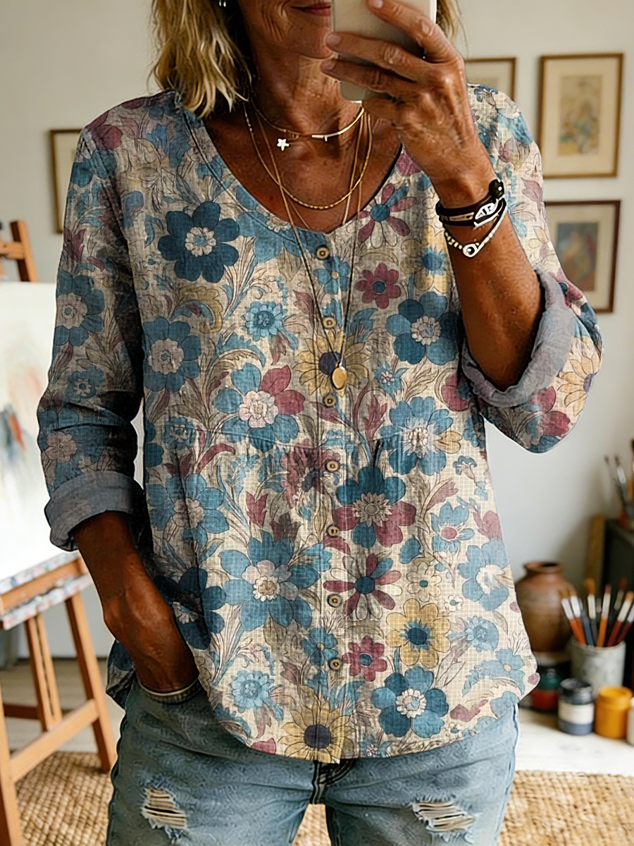 Women's Retro Floral Art Print Casual Long-sleeved Cotton Linen Shirt