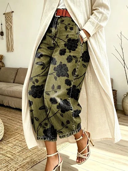 Women's Retro Floral Art Print Casual Washed Cotton Jeans