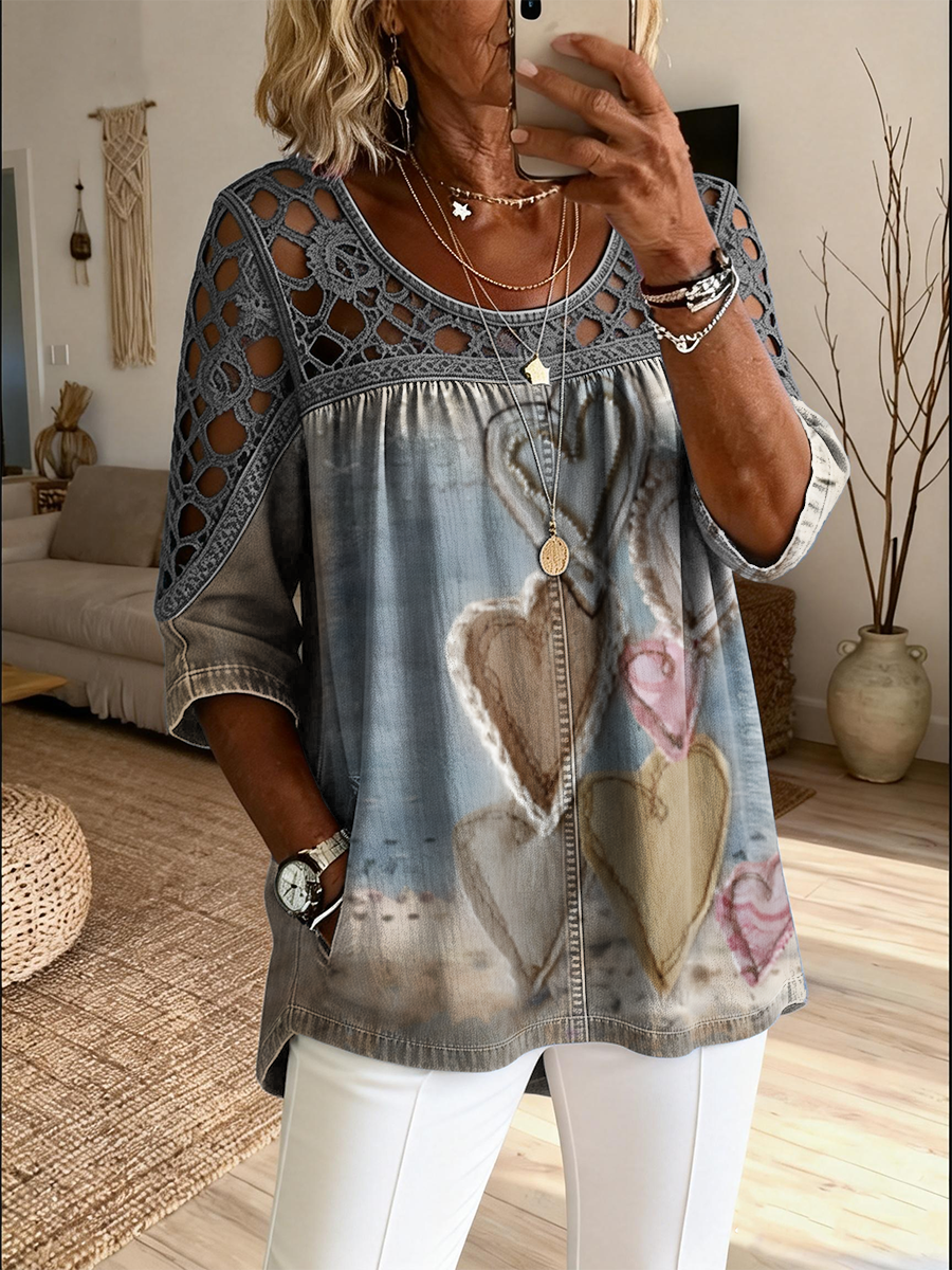 Women's Retro Heart Art Print Casual Three-quarters Sleeve Round Neck Hollow-out Top