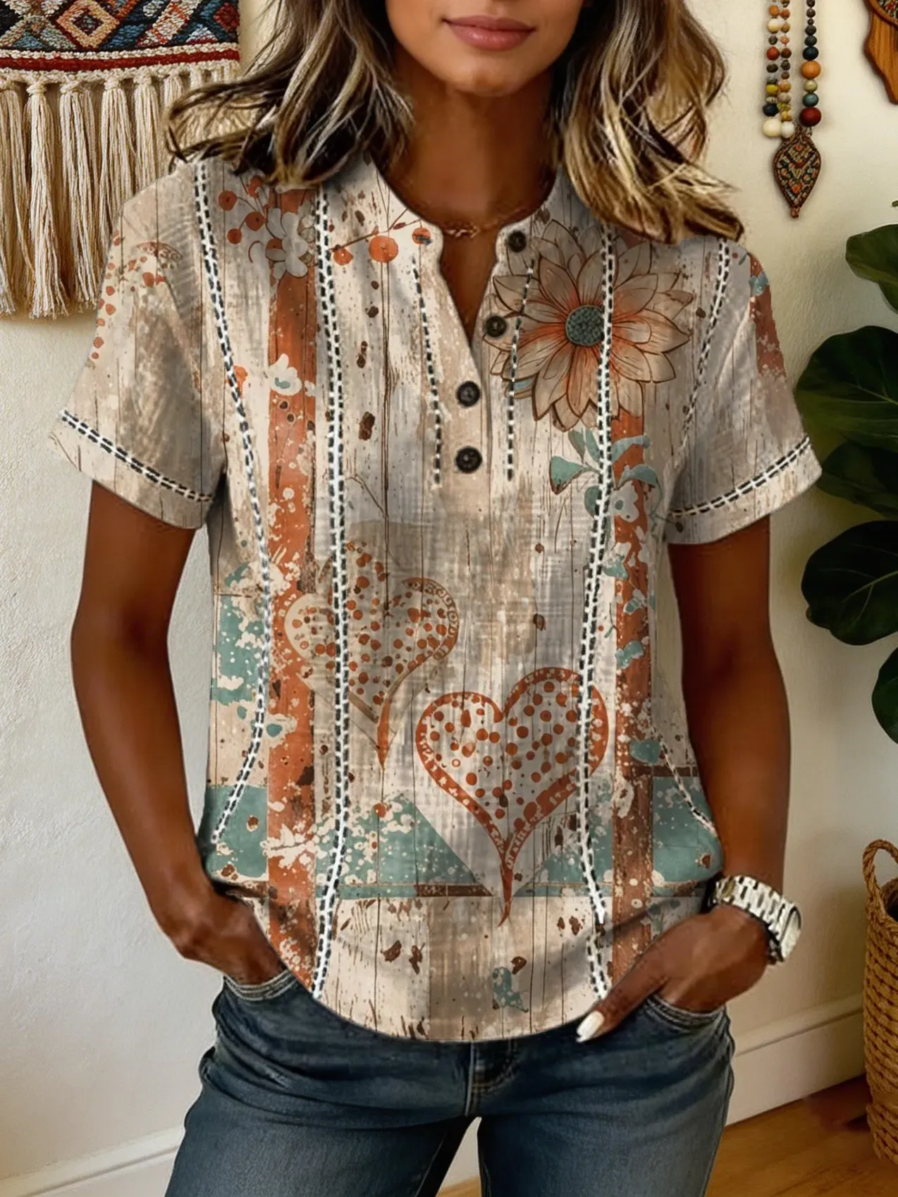 Women's Short-sleeve Cotton-linen Blouse With Artistic Daisy And Heart Print And Cut-out Details