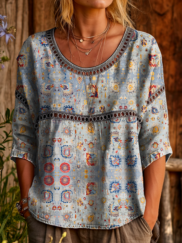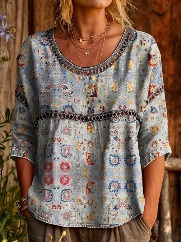 Womens Vintage Ethnic Gray Patterned Art Printed Casual Round Neck Cutout Top