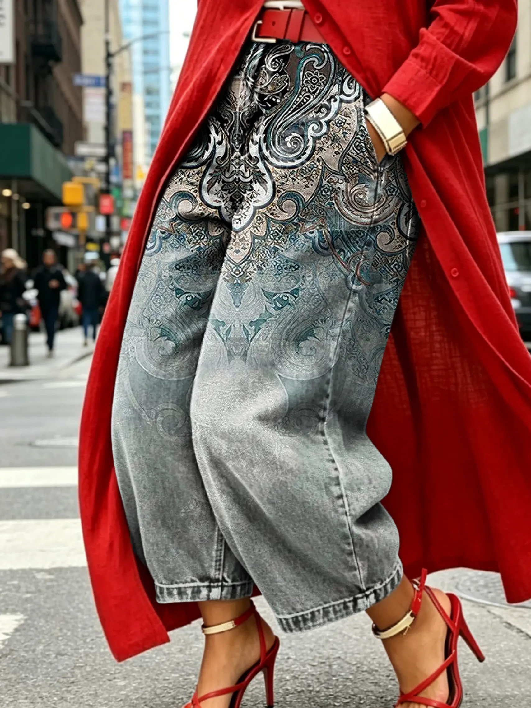 Women's Vintage Ethnic-print Artistic-print Jeans With Pockets