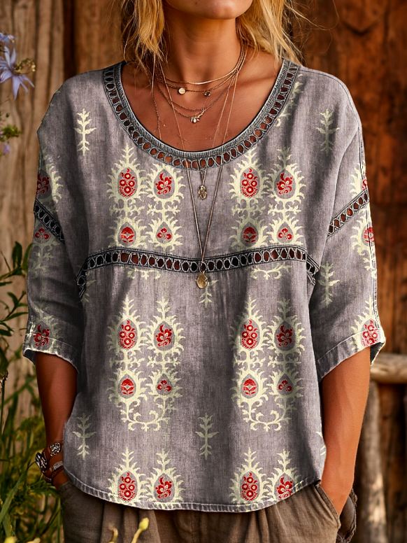Womens Vintage Ethnic Purple Floral Pattern Art Printed Casual Round Neck Cutout Top