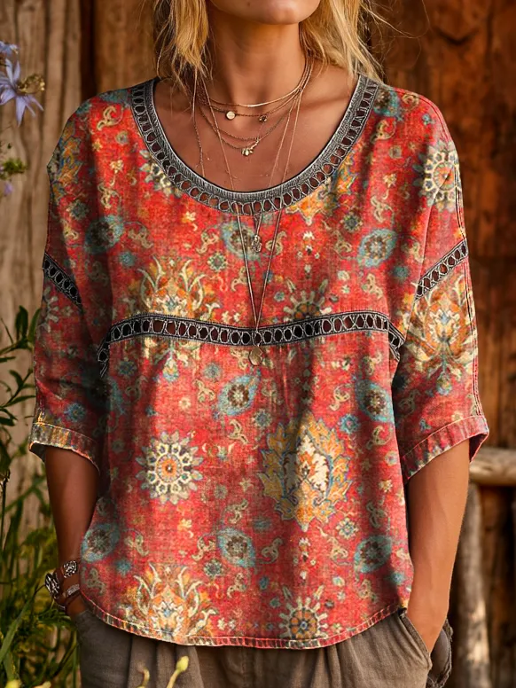Women's Vintage Ethnic Red Floral Art Prints Casual Round Neck Cutout Top