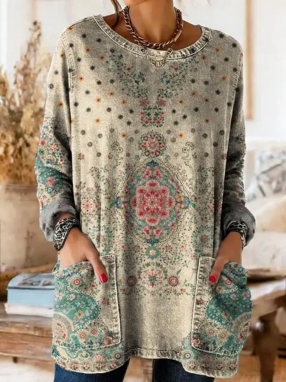 Women's Vintage Floral Pattern Art Print Casual Washed Denim Cotton Top