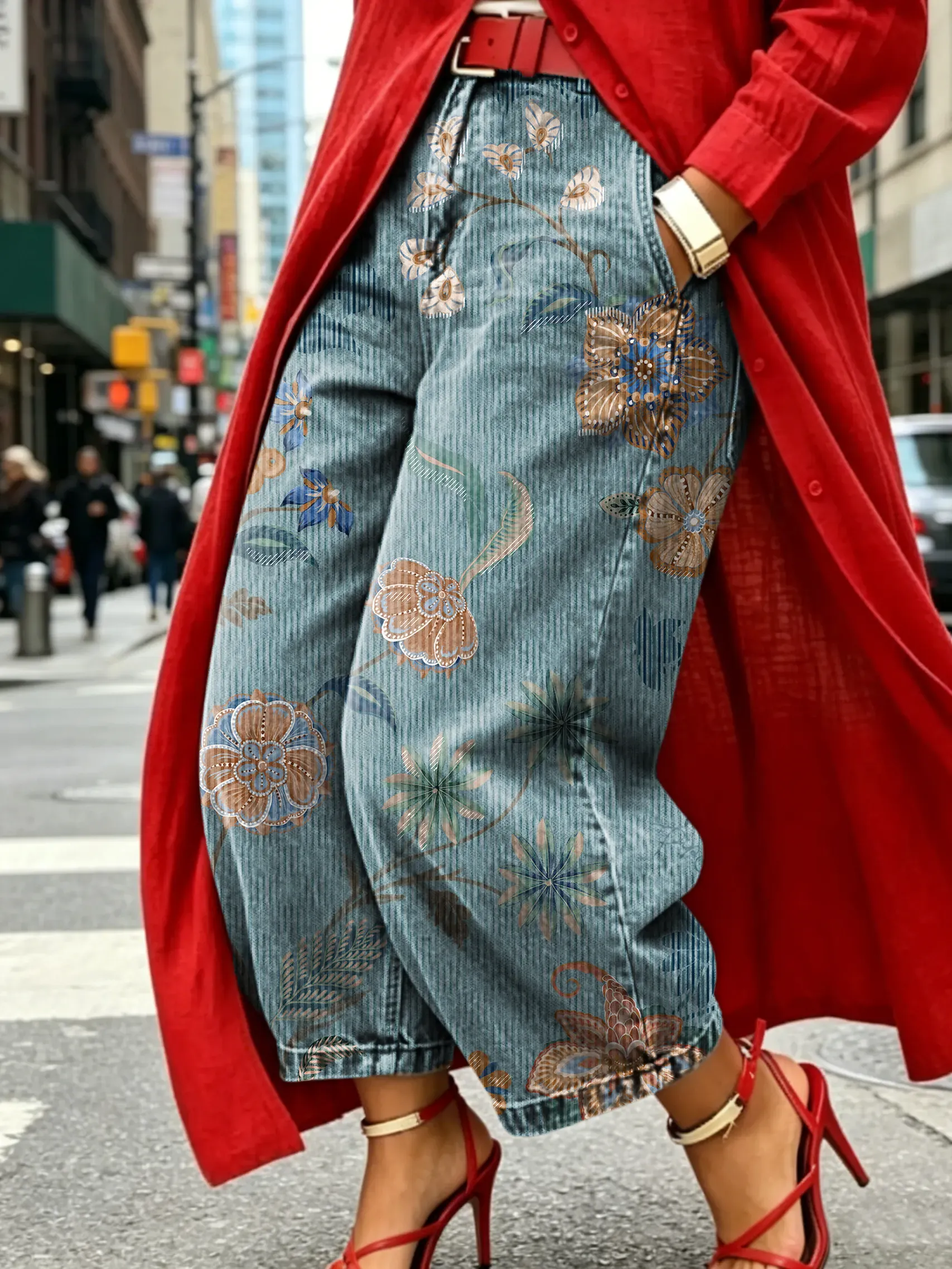 Women's Vintage Floral Print Jeans with Pockets