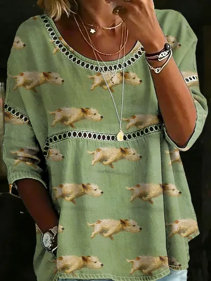 Women's Vintage Funny Cute Running Dog Casual Loose Denim Blouse Shirt
