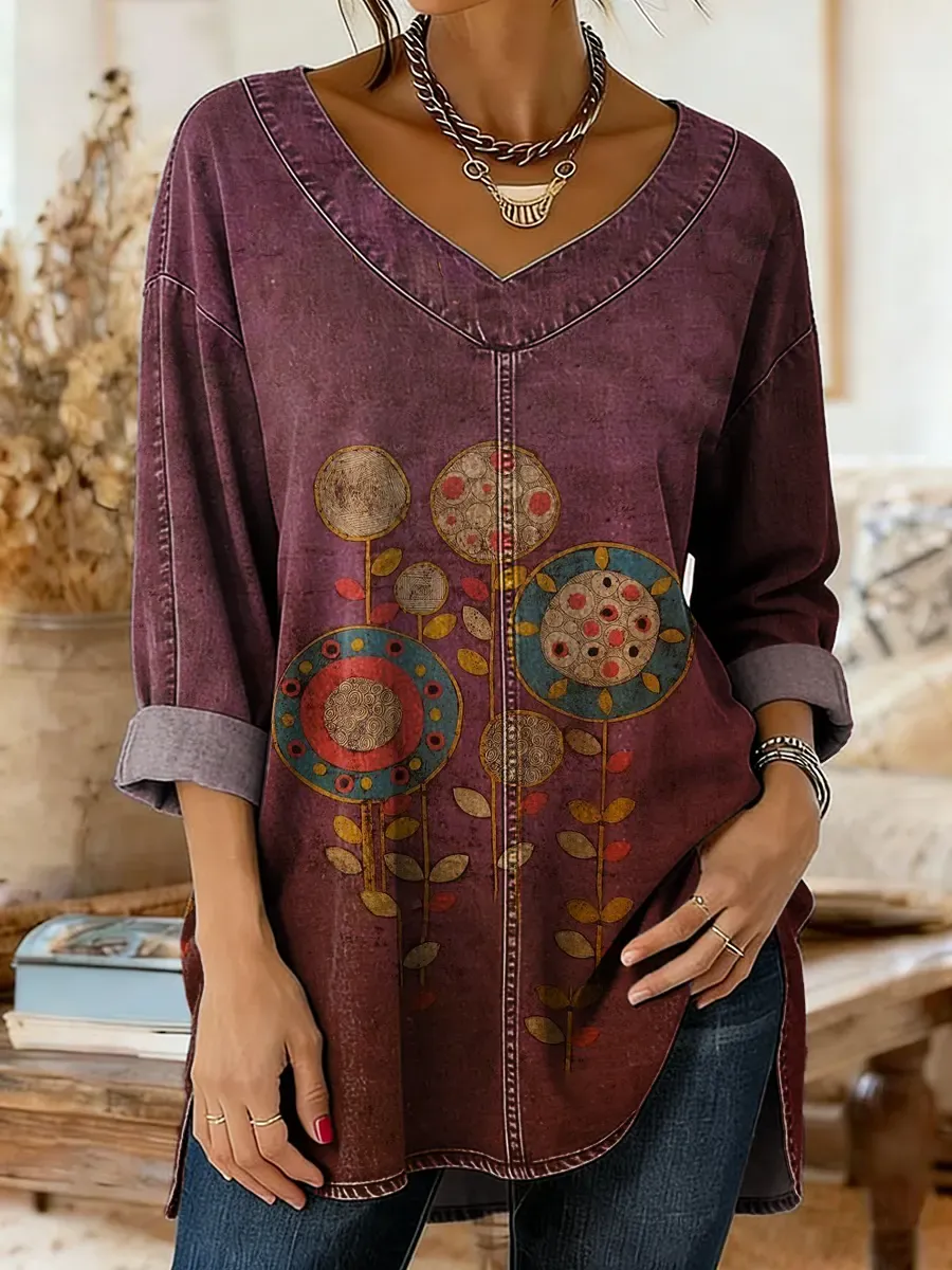 Women's Vintage Geometric Floral Art Print Washed Denim Cotton Top